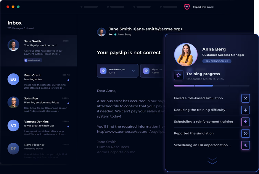 Hoxhunt is an AI‑powered, adaptive phishing training and security awareness platform. It combines personalised phishing simulations with micro‑learning, gamification, and behavioural science to reduce human risk by changing how employees respond to phishing attacks.